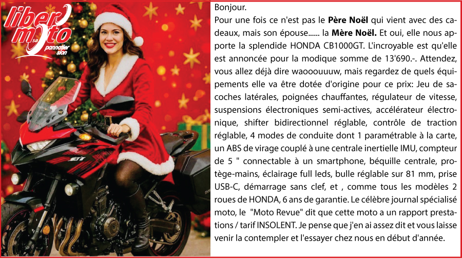 Que de bonnes nouvelles. Tous nos stocks sont pleins: Plus de 100 motos et scooters livrables de suite, 350 casques, 100 vestes, 120 paires de gants, des échappements Akrapovic, 320 pneus..... Mais n'attendez pas la dernière minute si vous voulez être bien servis.